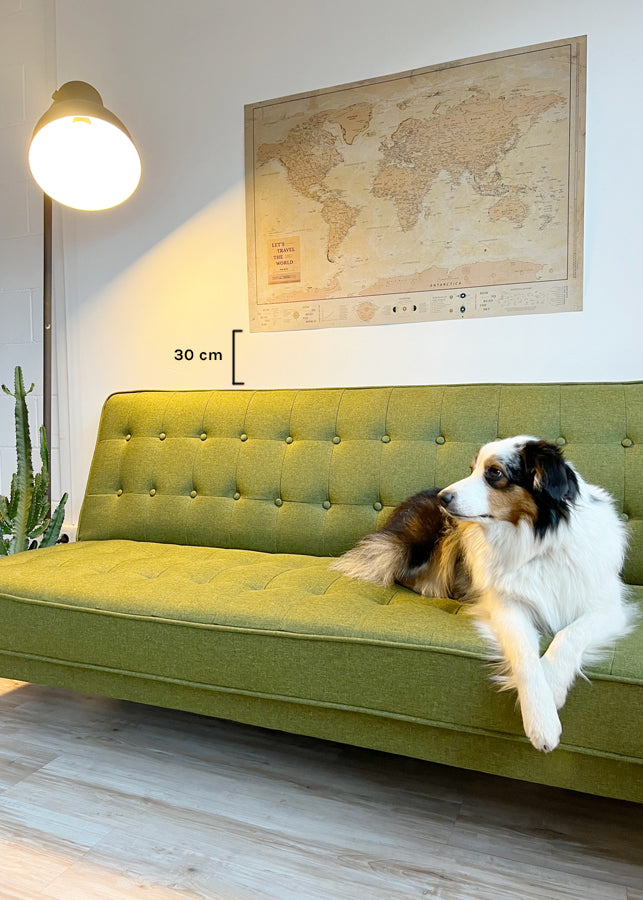 Si vas a colocar un cuadro o varios encima de un mueble, sofá o como cabecero de cama, este o estos deberían medir al menos dos tercios del mueble o elemento que se encuentra debajo de él. Dicho de otra forma, a simple vista no debería sobrepasar el largo del mueble o sofá.